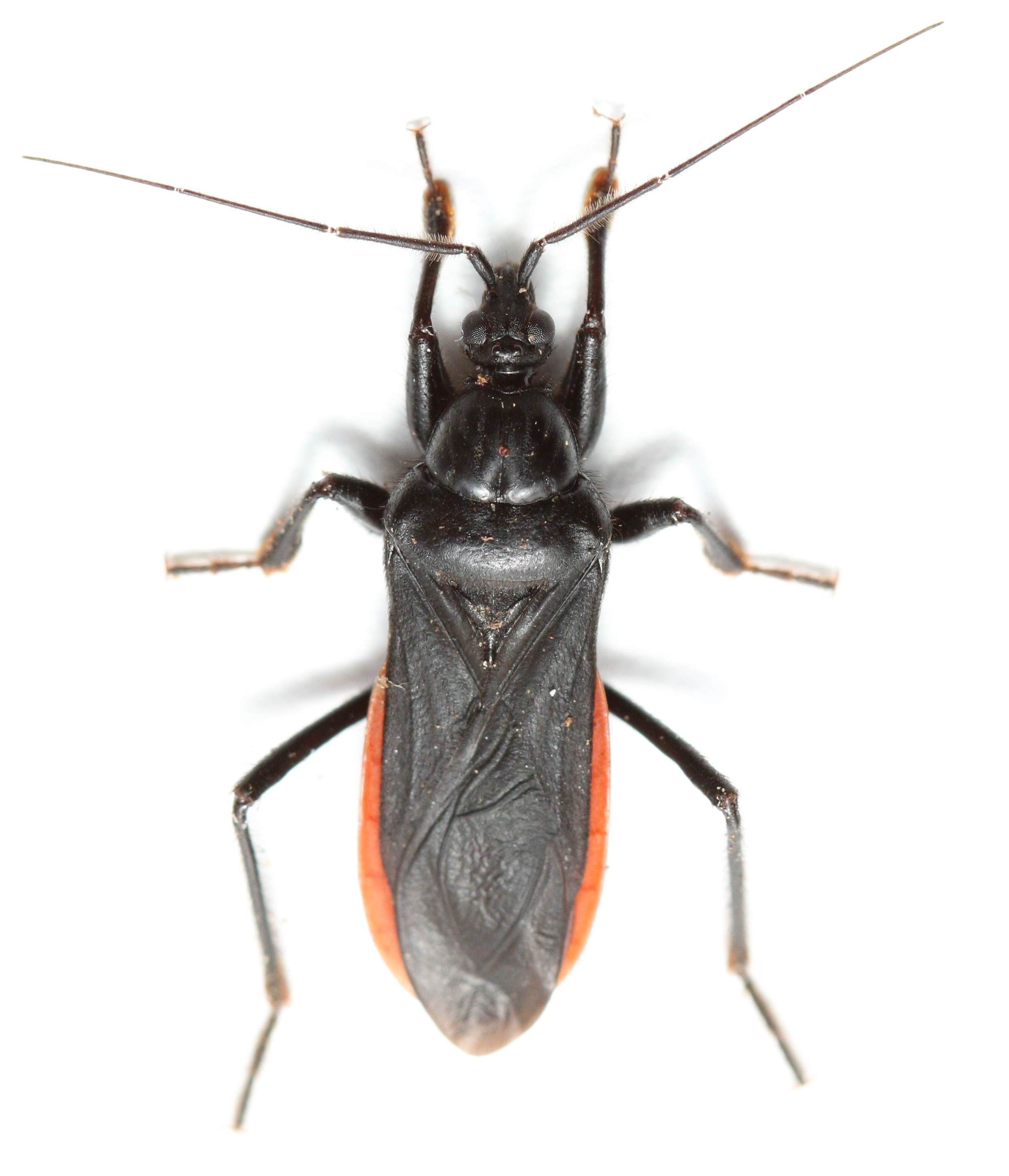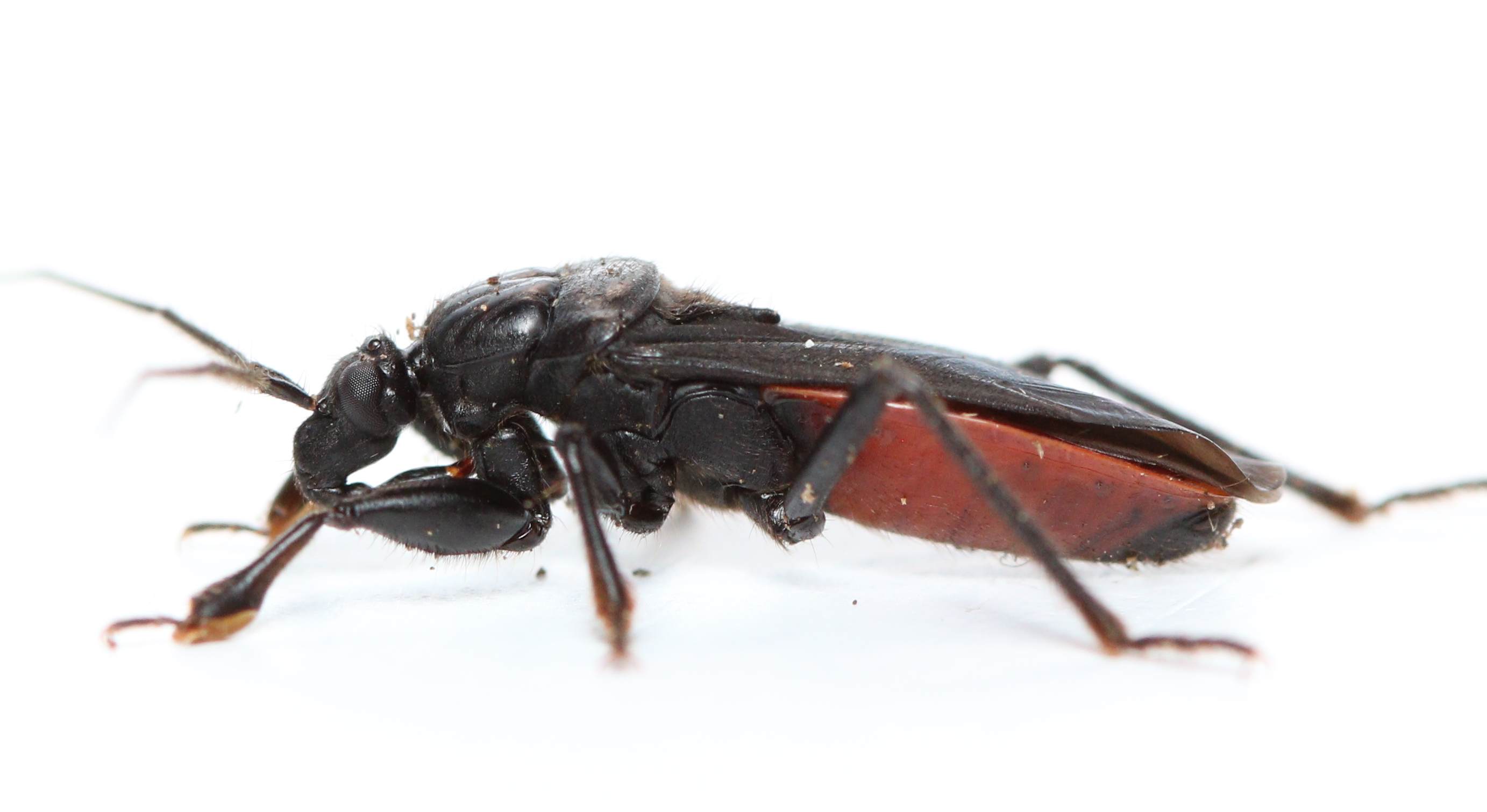 While we were at it, I figured to put in another good-sized true bug predator. The black corsair is one of the more common assassins at our place, but not one of my favorites. This one hides under logs unlike most of its cousins, and tends to hunt more helpless prey than its relatives, or else attacks its prey from behind. This species is unique in that it reportedly attacks large scarab beetles like May Beetles from behind, grabbing on with the sticky pads that you can see on the front pair of legs. A very cowardly and treacherous species (reminds me of Gollum from Lord of the Rings!).