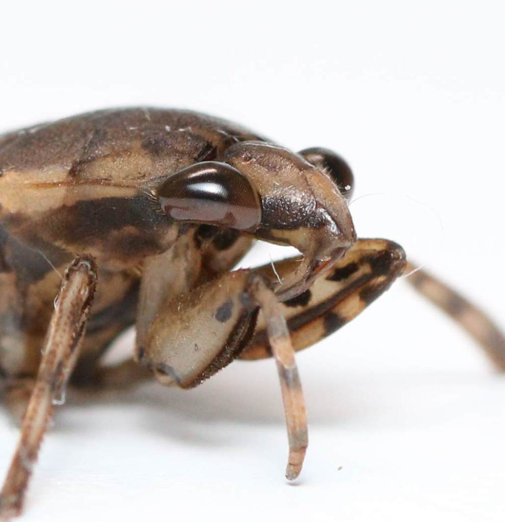 I feel obliged to hit you with yet another aquatic monster, this one a little more easy to find than the waterscorpion from last time. Last year we probably found close to ten of these while looking for aquatic beetles in our favorite spot. This particular specimen we have been keeping since last summer on dried crickets and other insects we catch. She still pounces on prey with the same ferocity that she showed when we first caught her. This species, unlike the waterscorpion, tends to hide in the mud and in the debris at the bottom of a lake to catch an unwary passerby. These guys tend to hide more and disguise less. That is why we bring them up so much when scooping up large mud samples with our net. But you can still see the same basic hunting technique: raptorial legs for grabbing prey and a rostrum for sucking them dry.