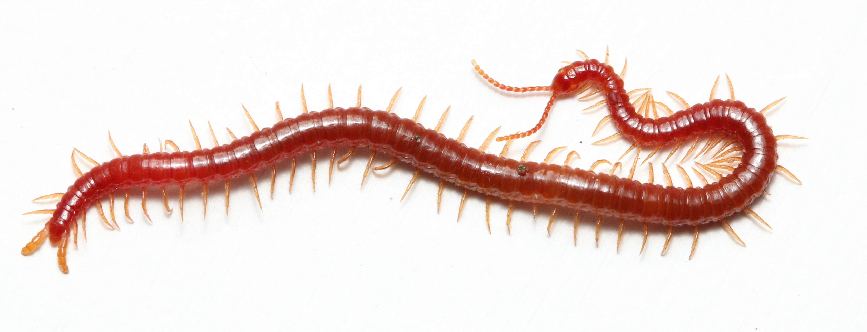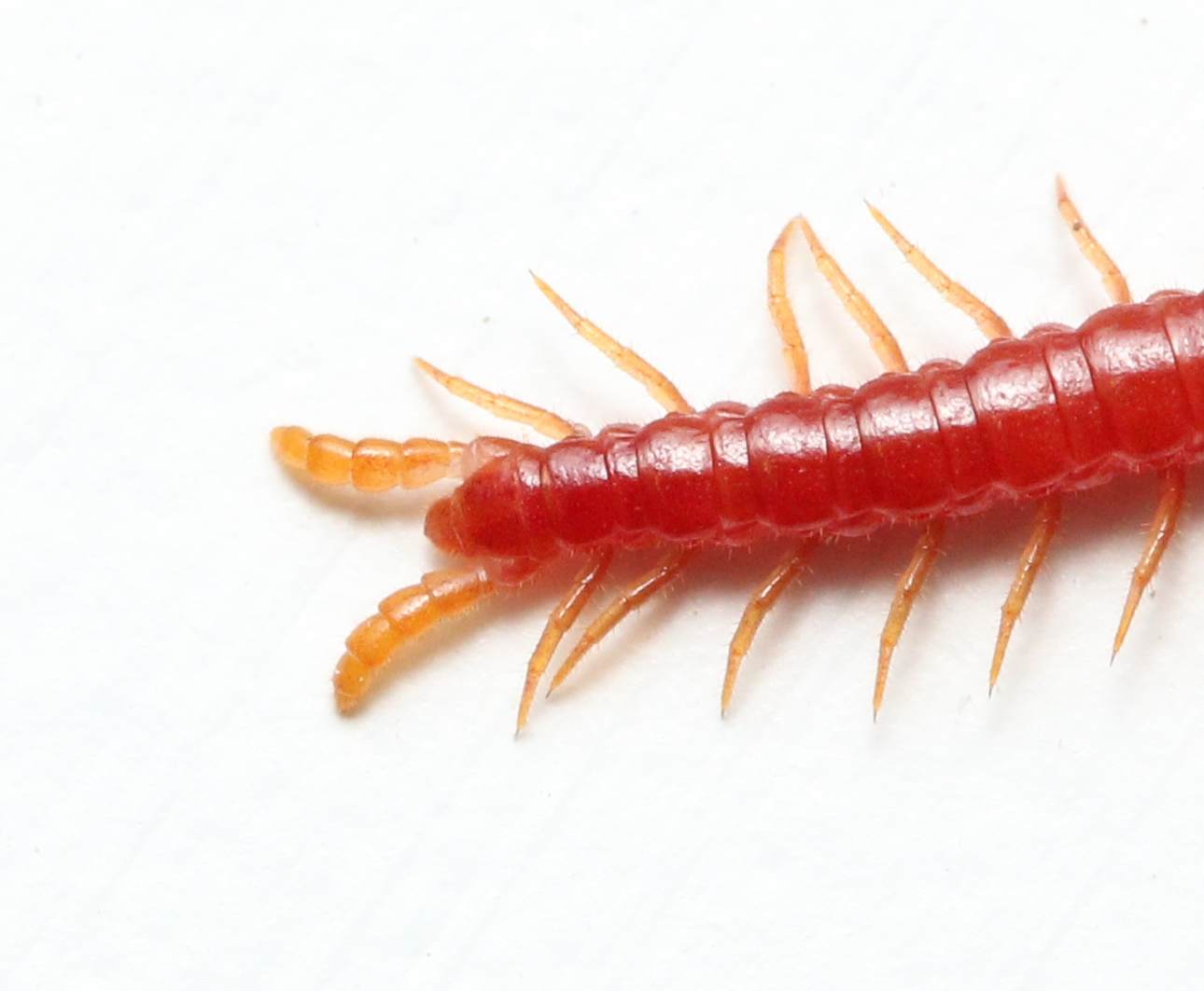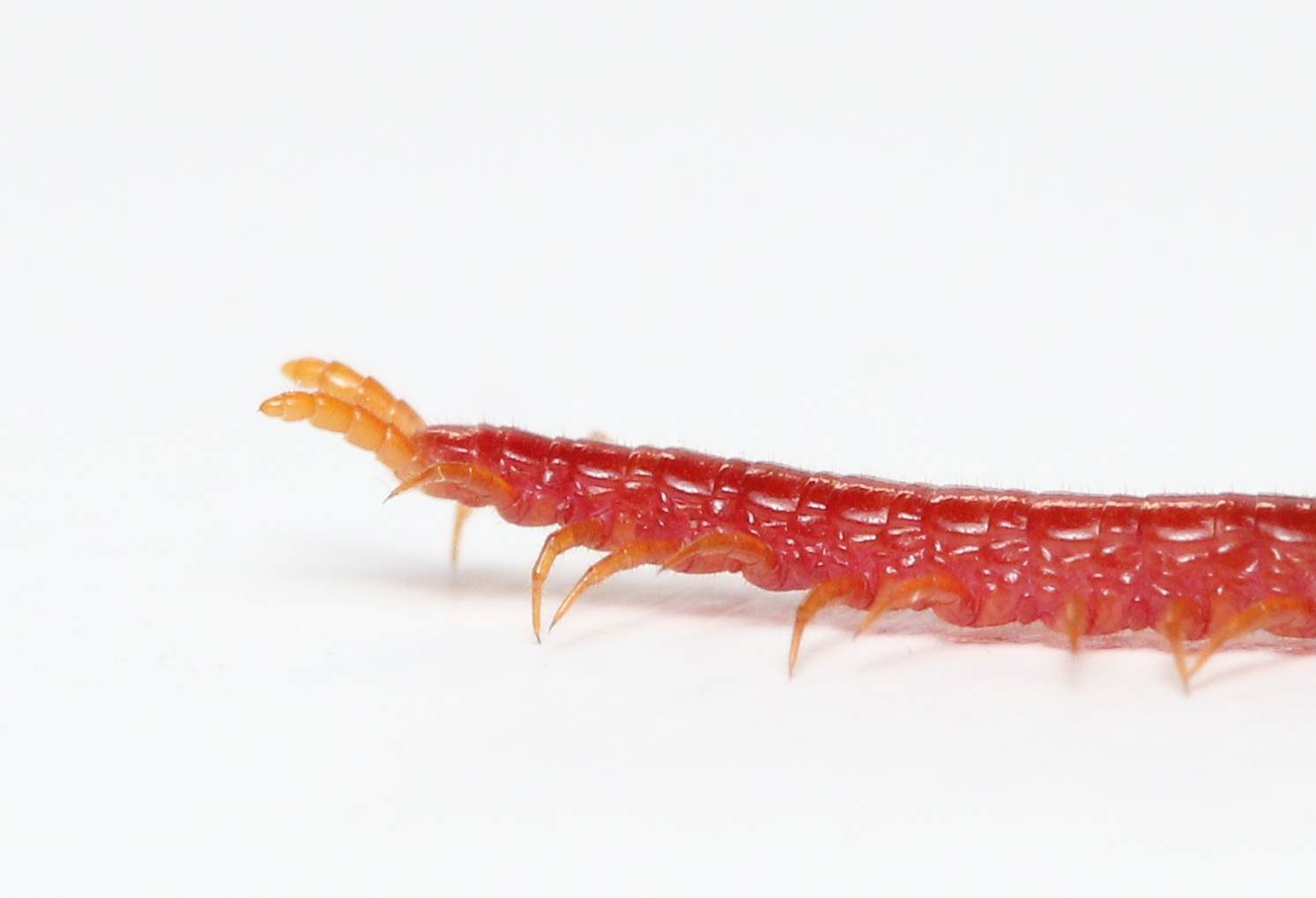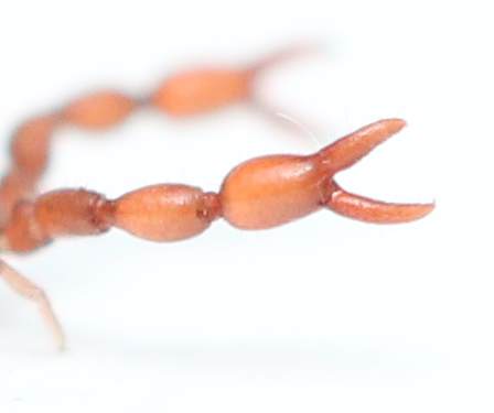 To finish off our little ecosystem study, we have to include the top member of the food chain. While we didn’t find this particular specimen in our container, we have confirmed there is a soil centipede in there. If you have read my millipede/centipede comparison, you will know why centipedes are the top of the micro-world food chain. In particular, soil centipedes are the ones that specialize in small arthropods, and strike terror into the hearts even of pseudoscorpions. Just take in that amazing cherry coloration! This guy was much nicer to me as a photographer than the brown centipede, and was thoughtful enough to realize that I deserved a bit of a break from the crazy activity that I had been tormented by in almost every other subject that day. While we do find soil centipedes often, we seldom find one with this coloration. We mostly find one of the smaller and more boring species in the genus Geophilus.