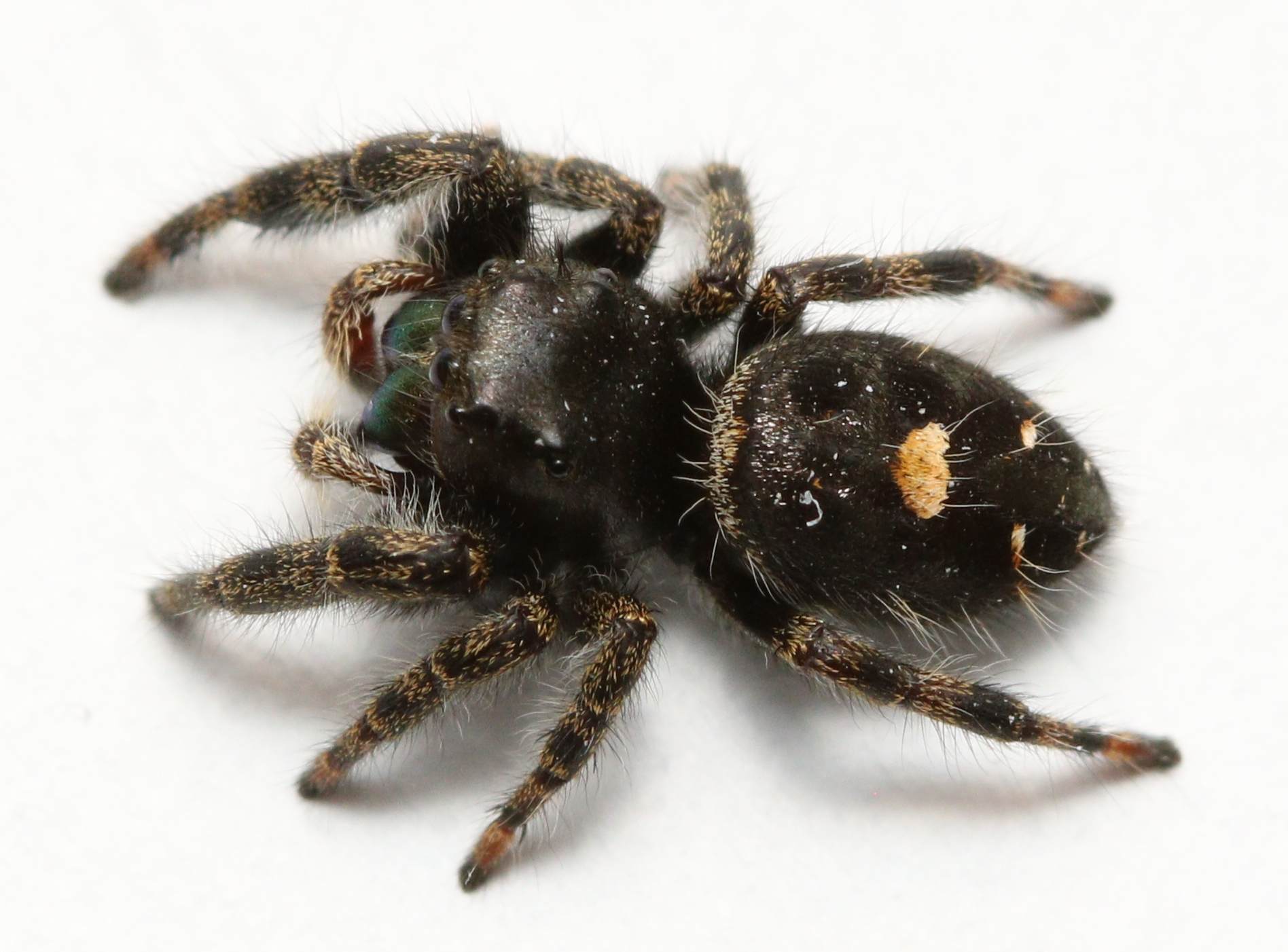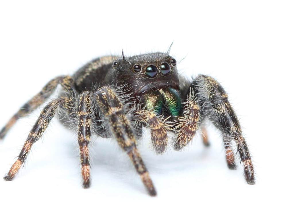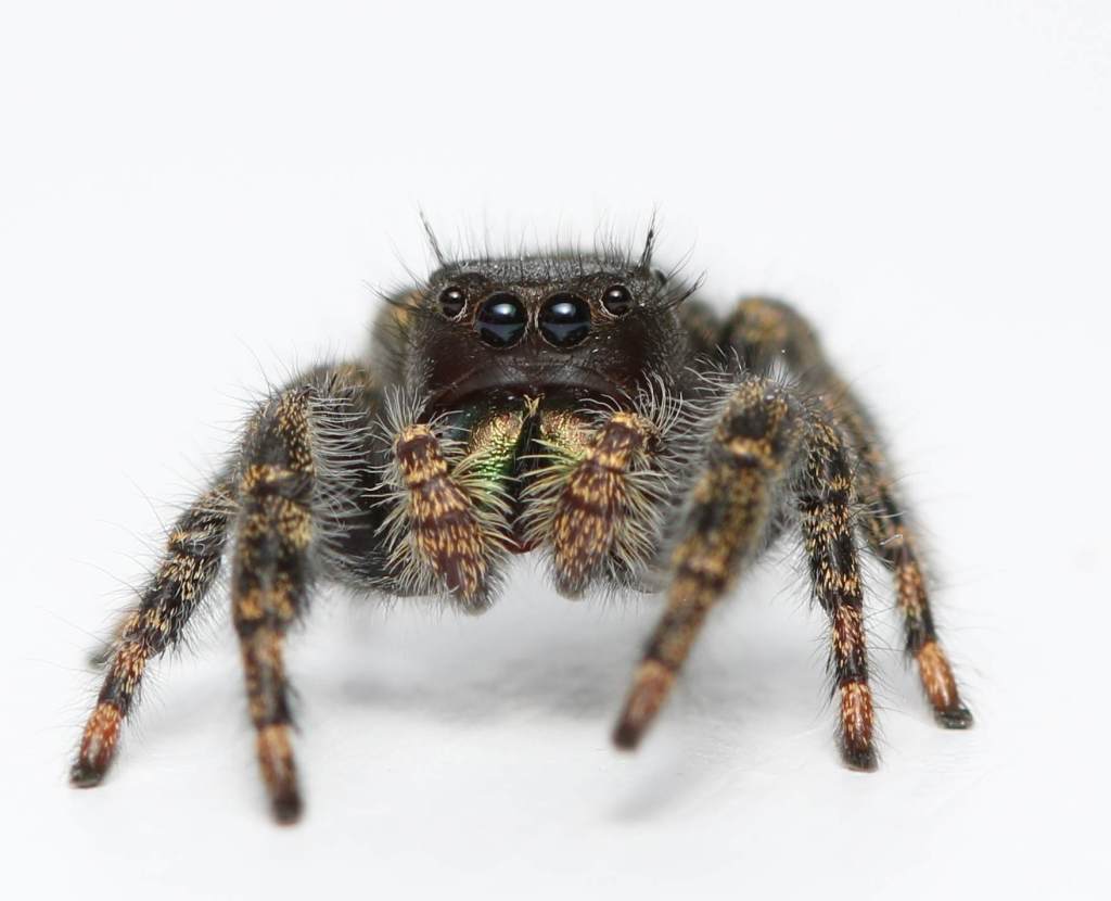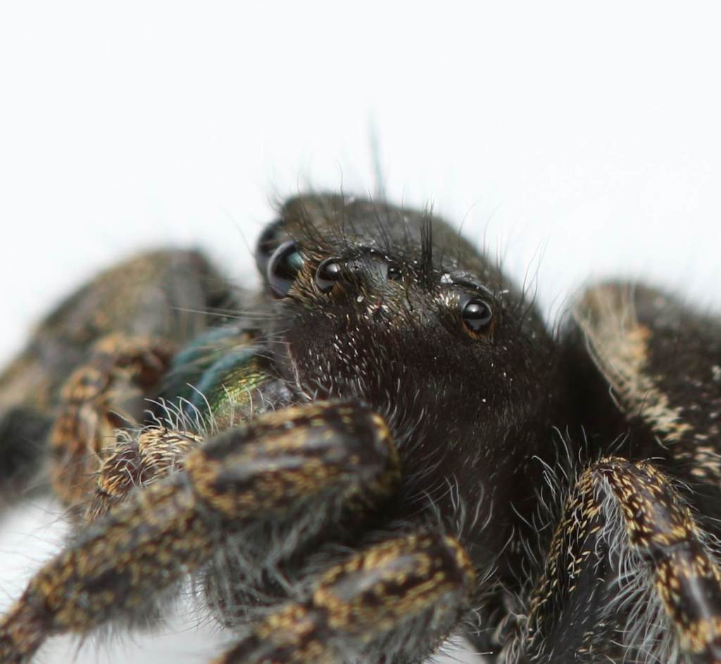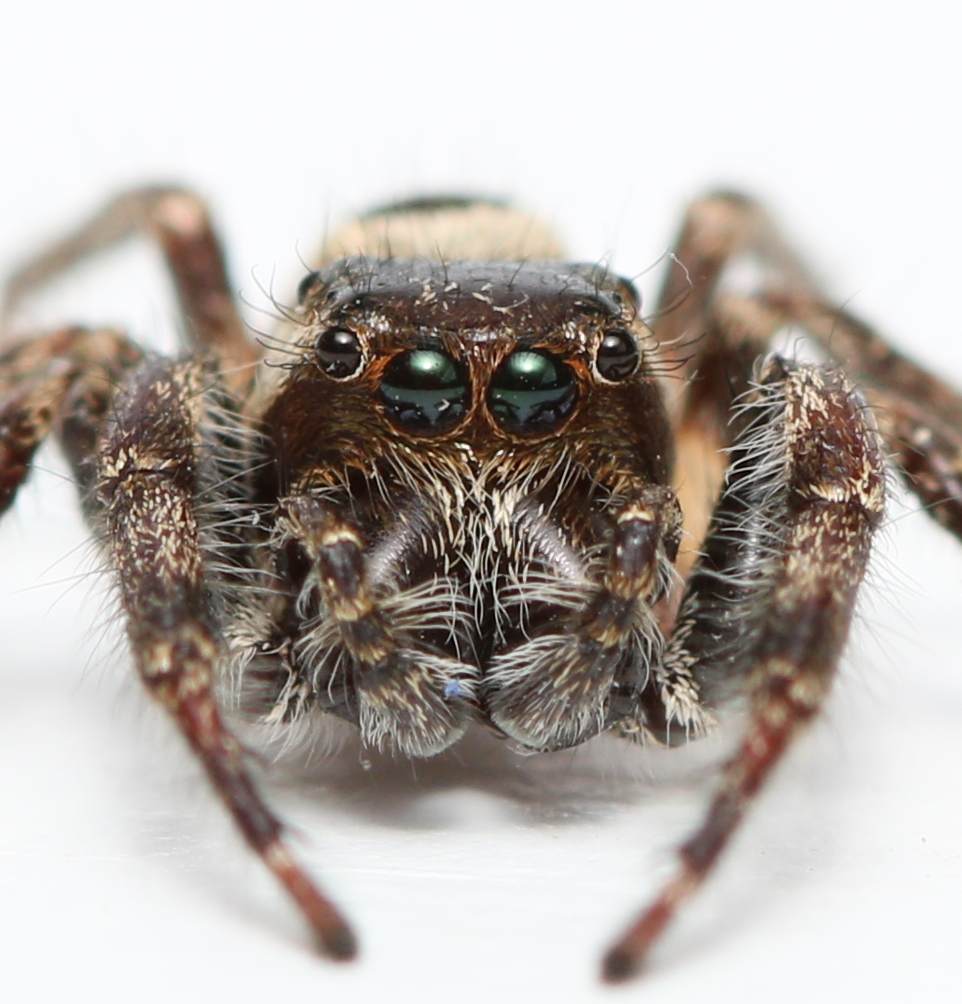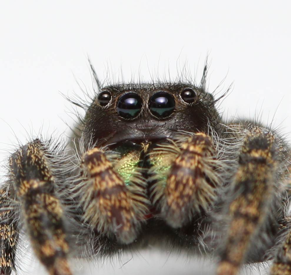 Jumping spiders also make very rewarding photography subjects, with their highly reflective eyes, large and often iridescent fangs, and the postures they adopt due to their constant attempts to visually scan their surroundings. I find it so funny when I make a sudden move or my flash flares, and the jumper leaps back an inch or so, immediately starting to scan the skies for the source of this unexpected disturbance.